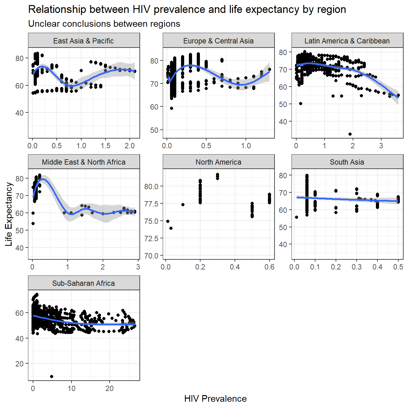 The graph below illustrates that particularly in the Middle East & North Africa, Latin America & Caribbean, Sub-Saharan Africa there is a clear relationship showing that with higher levels of HIV prevalence, life expectancy declines, this can be expected as, particularly in the past, the disease would virus was life threatening. However, East Asia & Pacific, and Europe & Central Asia show some ambiguous results. Perhaps showing the relationship between HIV prevalence and life expectancy is picking up the indirect effects of other factors such as poor health infrastructure or lower sanitary standards.