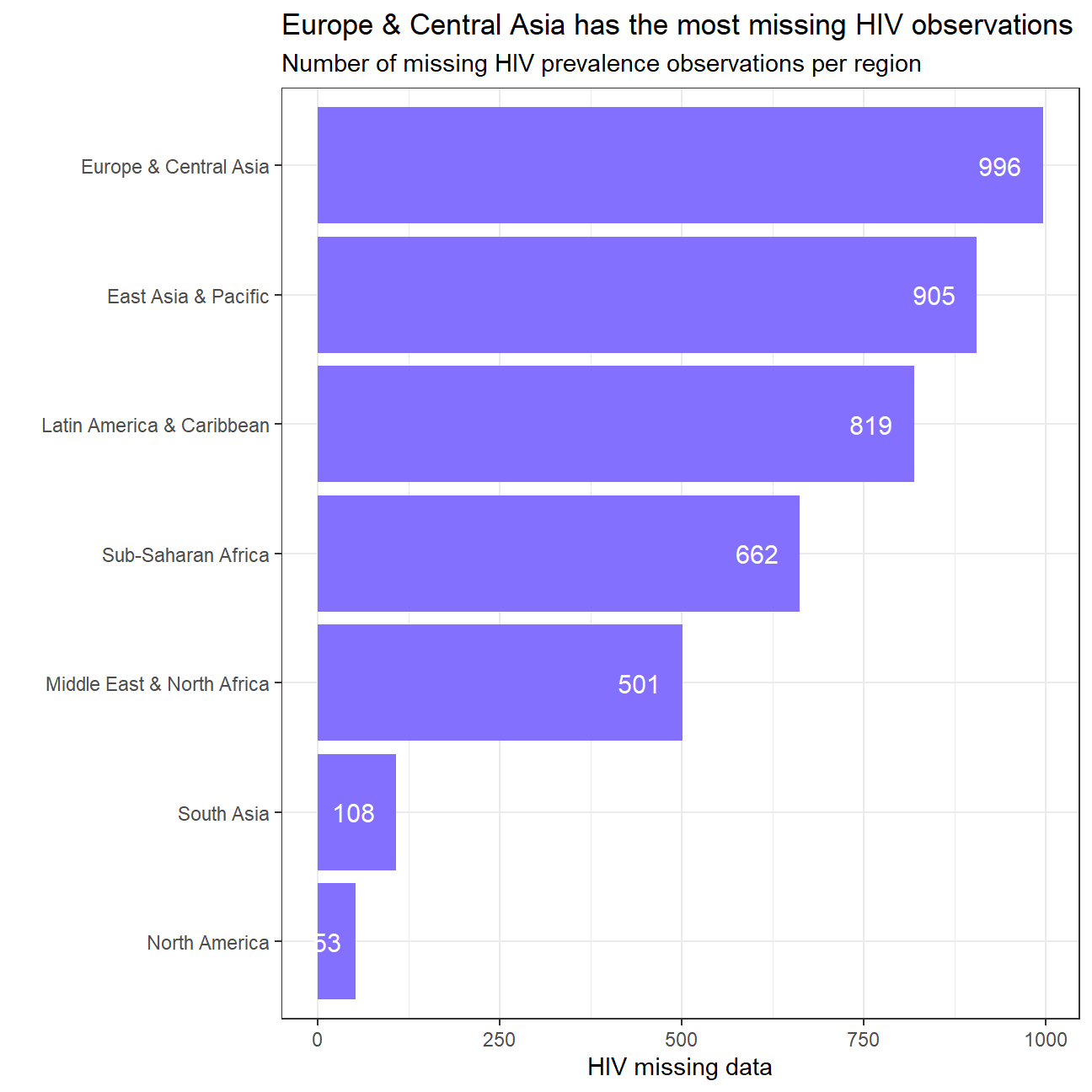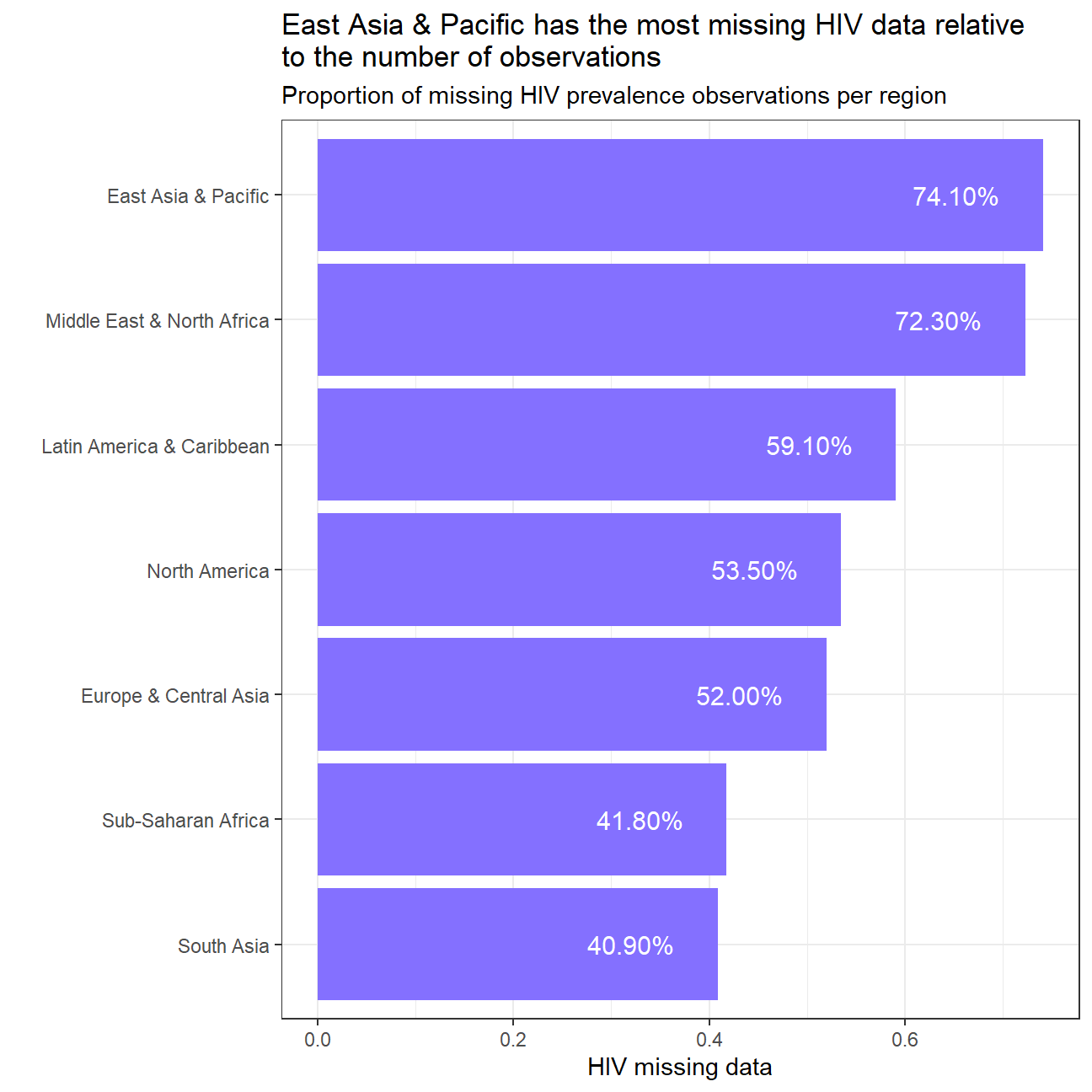 title="East Asia & Pacific has the most missing HIV data relative \nto the number of observations",