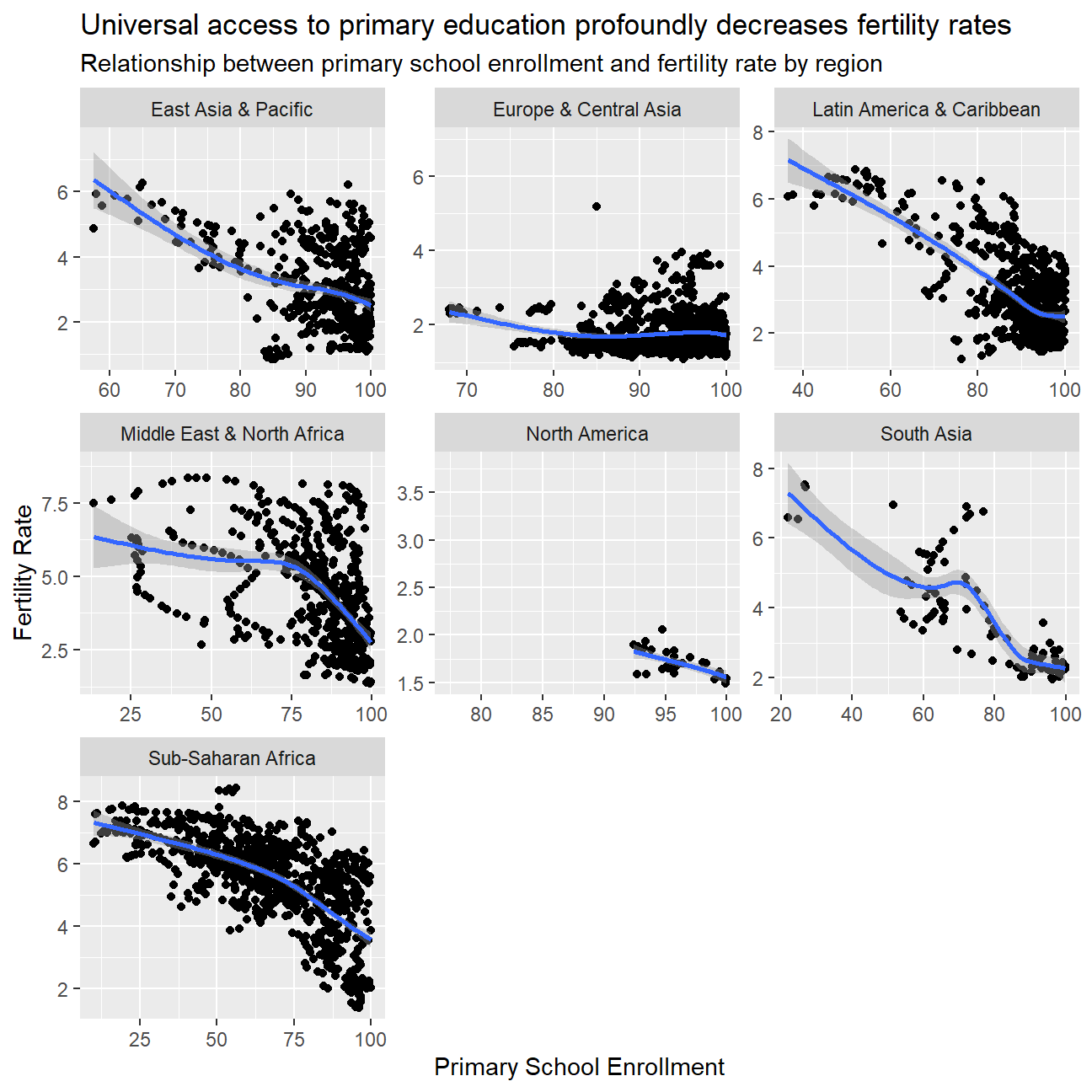 subtitle = "Relationship between primary school enrollment and fertility rate by region"